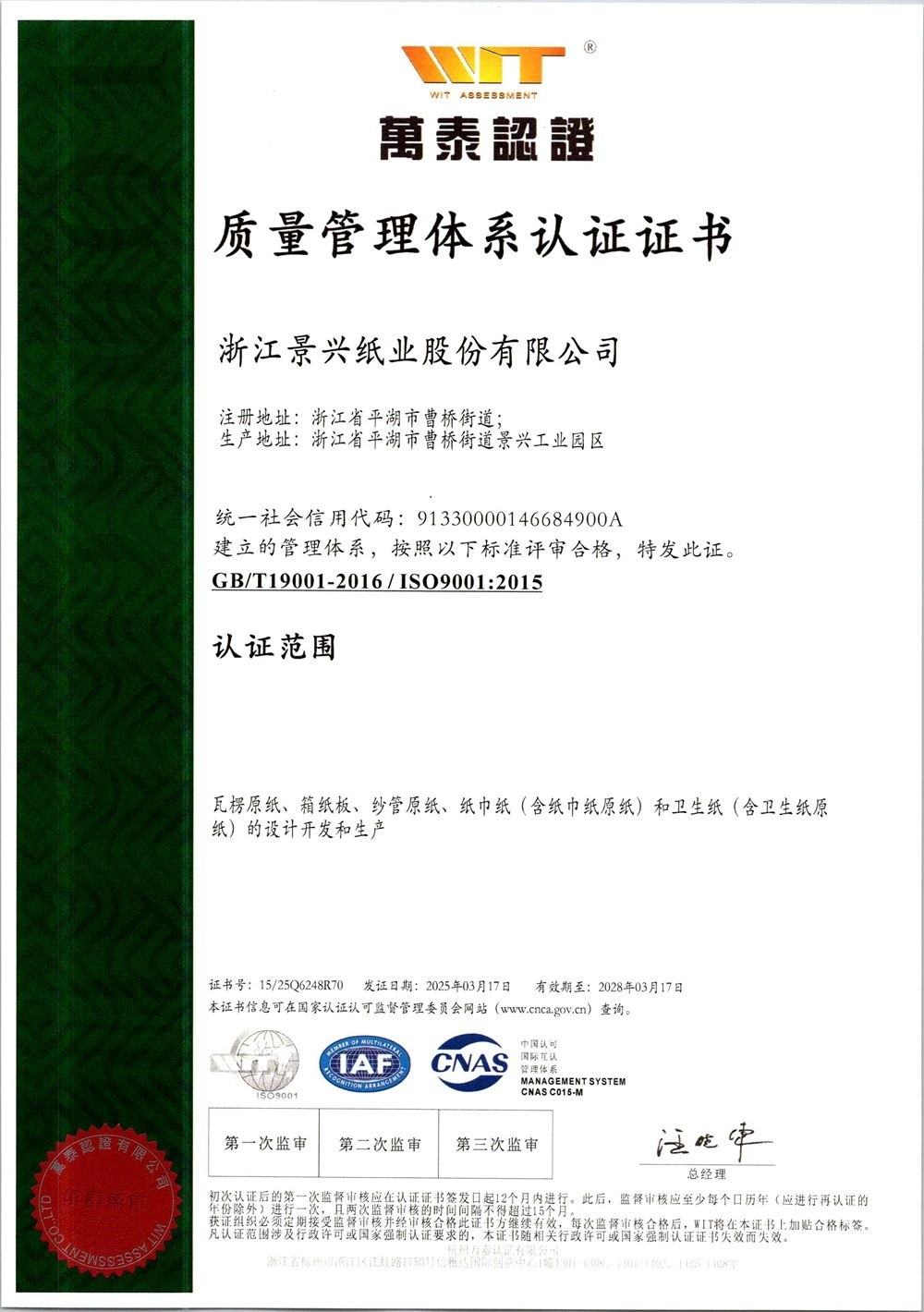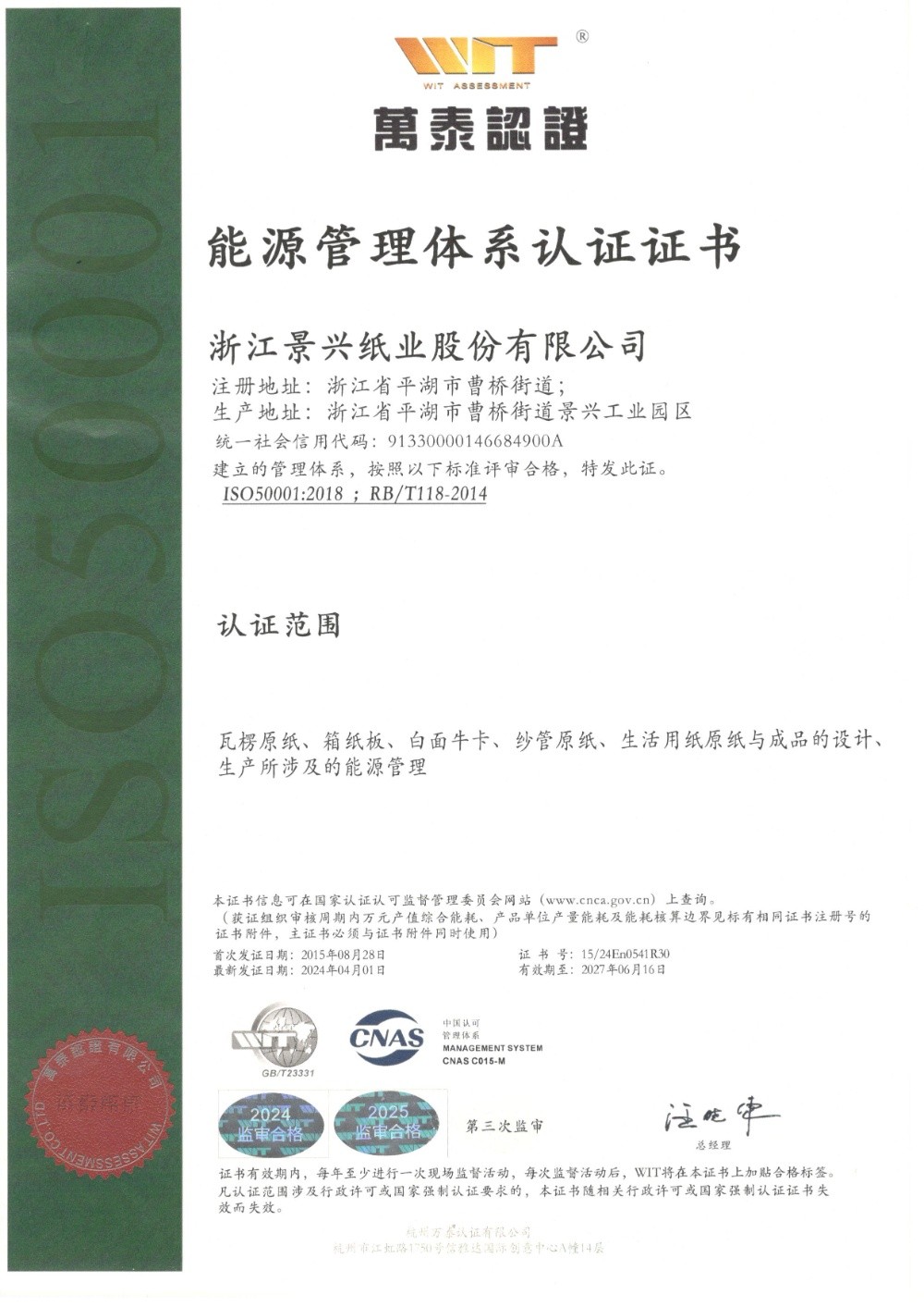 金沙9001以诚为本于1996年率先在同行业通过ISO9001质量管理体系认证,2002年通过ISO14001环境管理体系认证,2014年通过OHSAS18001职业健康安全管理体系认证,2015年通过GB/T23331能源管理体系和FSC®森林体系认证,2018年通过两化融合管理体系认证。